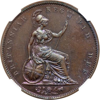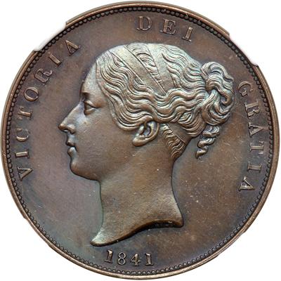 Great Britain. Bronzed Proof Penny, 1841. S.3948; KM-739. Victoria, 1837-1901. Obverse: Wyon's young portrait of Queen left. Reverse: Britannia seated right with shield and trident. A stunning coin with a light blue and brown patina. Very rare in any high grade, this is a coin which seldom appears for sale. Peck only lists the Fred Baldwin specimen, which may be this piece. Many many times rarer than the 1839 Proof Penny, the 1841 Proof is probably under rated in the catalogues. In a new NGC 4 prong holder. NGC graded Proof 64 Brown.
