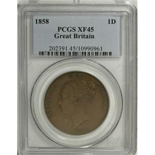 <B>Brown English duo plus an Aussie:</B></I> George IV LH Farthing 1822, AU55 PCGS, chocolate brown, 1858 Victoria YH Penny, XF45 PCGS, very pleasing, Australia Penny George V 1925, VF details, polished, NCS slab.<BR><BR><b>Shipping:</b> Coins & Currency (<a target="_blank" href="http://www.heritageauctions.com/common/shipping.php">view shipping information</a>)