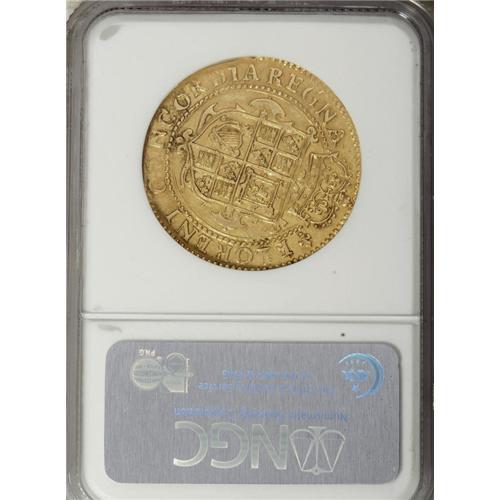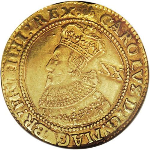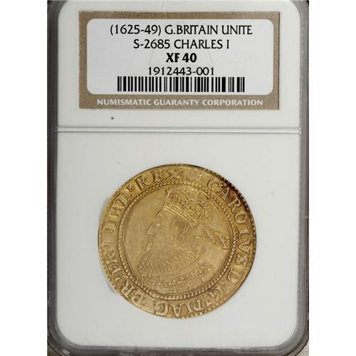 <B>Charles I (1625-49) Unite,</B></I> S-2685, N-2147, Lis mintmark as used in 1625 at the Tower Mint, XF40 NGC. Well considered by the grading company because this is an exceptionally balanced piece, on a full and nearly round flan, the engraving detailed and well preserved, the color a most pleasing, mellow gold. Patches of verdigris in the legend's letters, here and there. The surfaces are exceptional. Parliament had not yet wrested control of much of anything from the king, in this his first year of reign, and here he is depicted in his Coronation Robes. His scrawny face bears the long, pointed beard. Chillingly, the reverse legend translates to read, in English, "united kingdoms flourish." Charles' halcyon days were short lived as the kingdom's unity evaporated about 15 years after this piece was minted. Should be worth all or more of Spink catalogue value for an "English VF" as this is far finer than most.<BR><BR><b>Shipping:</b> Coins & Currency (<a target="_blank" href="http://www.heritageauctions.com/common/shipping.php">view shipping information</a>)