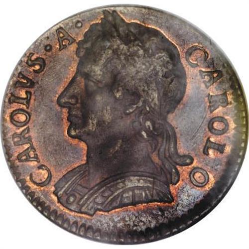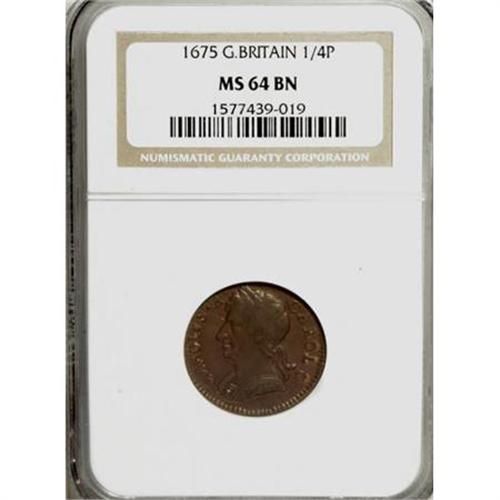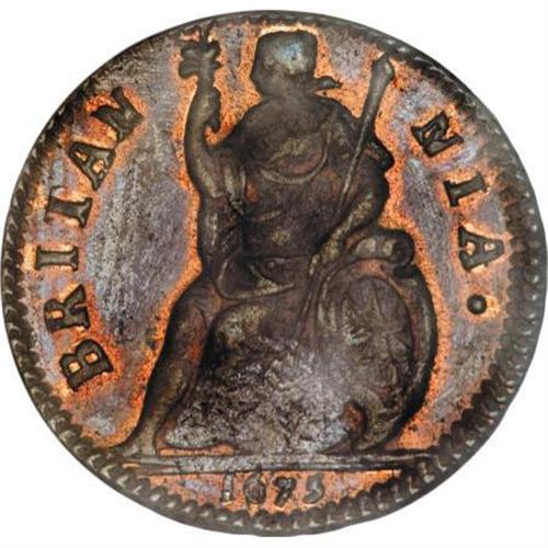 <B>Charles II copper Farthing 1675,</B></I> S-3394, MS64 BN NGC, mushy strike in the centers as nearly always seen, but a pleasing and high-grade example of this, the first "modern" or machine-made coin of this denomination. Some remnant mint red luster glows around the legend letters on both sides.<BR><I>From The Madison Collection.</B></I><BR><BR><b>Shipping:</b> Coins & Currency (<a target="_blank" href="http://www.heritageauctions.com/common/shipping.php">view shipping information</a>)
