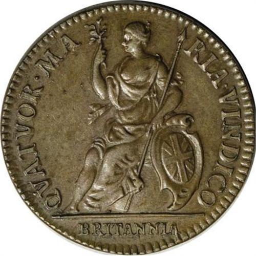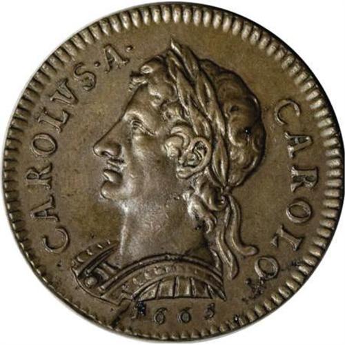 <B>Charles II pattern copper Farthing 1665,</B></I> Peck-412, short hair, plain edge. Dies engraved by John Roettier, of the talented Dutch family so favored by the son of Charles I. These pieces, struck in sizable quantities albeit technically patterns, are the first in the English copper series to depict the now-famous Seated Britannia effigy on the reverse side. Wilson Peck comments that the image was inspired by the allegorical figure symbolizing the Province of Britain to the Romans, as it had appeared on bronze sestertii of the emperor Antoninus Pius (and on other Roman issues with which the Dutch engraver was doubtless familiar). As well, Peck believed that the Duchess of Richmond (now a suburb of London), Frances Stewart, was the model for Britannia's face upon this coin; he states that Roettier had probably seen the then-new portrait of her, done in 1664. The farthing features a superb likeness of King Charles II when young. The obverse legend is essentially a cry for joy at the return of the king, who had been hiding in France all during the Civil War. The reverse legend translates to mean "I claim the four seas" and is reputed to allude to the king's interest in strengthening the Royal Navy. In this sense, this particular coinage represents the beginning of the British Empire, Britain's wish to rise to a level of prominence whereby it could rule the seas. The question now arises: why would a pattern be struck in large numbers and then circulate broadly? By 1670 there had been proclamations in the House of Lords, of Parliament, about the need for more small change; thus the dies for these patterns, in their various versions, seem to have been brought out and used for some years to make commercial coins. Some of the dies were worn, and many of these farthings appear lacking detail. Most, however, circulated for decades. Finding an unworn piece struck from fresh dies, such as the present example, is thus quite extraordinary. Uncirculated with chocolate-brown, semi-prooflike surfaces, only a few tiny abrasions in the lovely fields, and boldly struck. The very image of the monarchial claims the coin was meant to represent!<BR><BR><b>Shipping:</b> Coins & Currency (<a target="_blank" href="http://www.heritageauctions.com/common/shipping.php">view shipping information</a>)