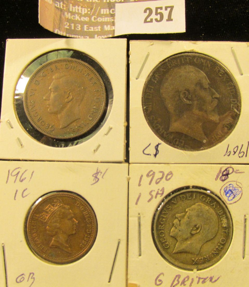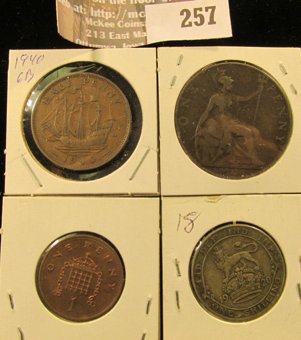 Great Britain Coins: 1940 Half Penny, 1904 Large Penny, 1961 New Penny, & 1920 Silver Shilling.