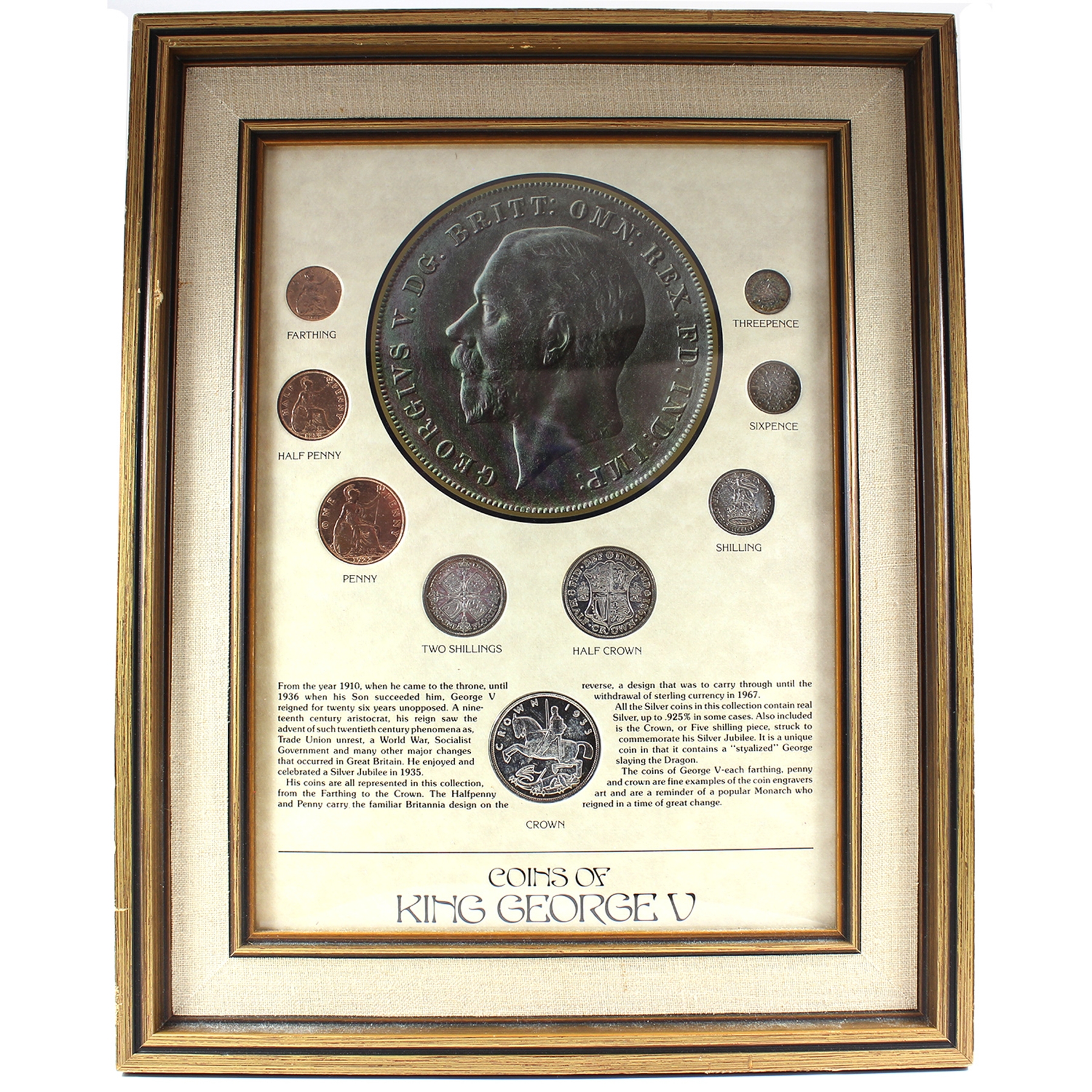 The frame displays the farthing, half penny, penny, three pence, six pence, shilling, two shillings, half crown, & crown. Coins are toned.
