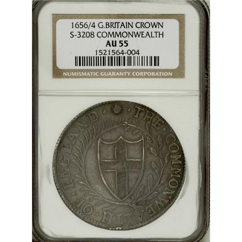 <B>Commonwealth Crown 1656/4,</B></I> S-3214, Sun mintmark, AU55 NGC, medium gray toning, no cracks in a nice, round flan. Not perfect but difficult to locate so fine as this.<BR><BR><b>Shipping:</b> Coins & Currency (<a target="_blank" href="http://www.heritageauctions.com/common/shipping.php">view shipping information</a>)