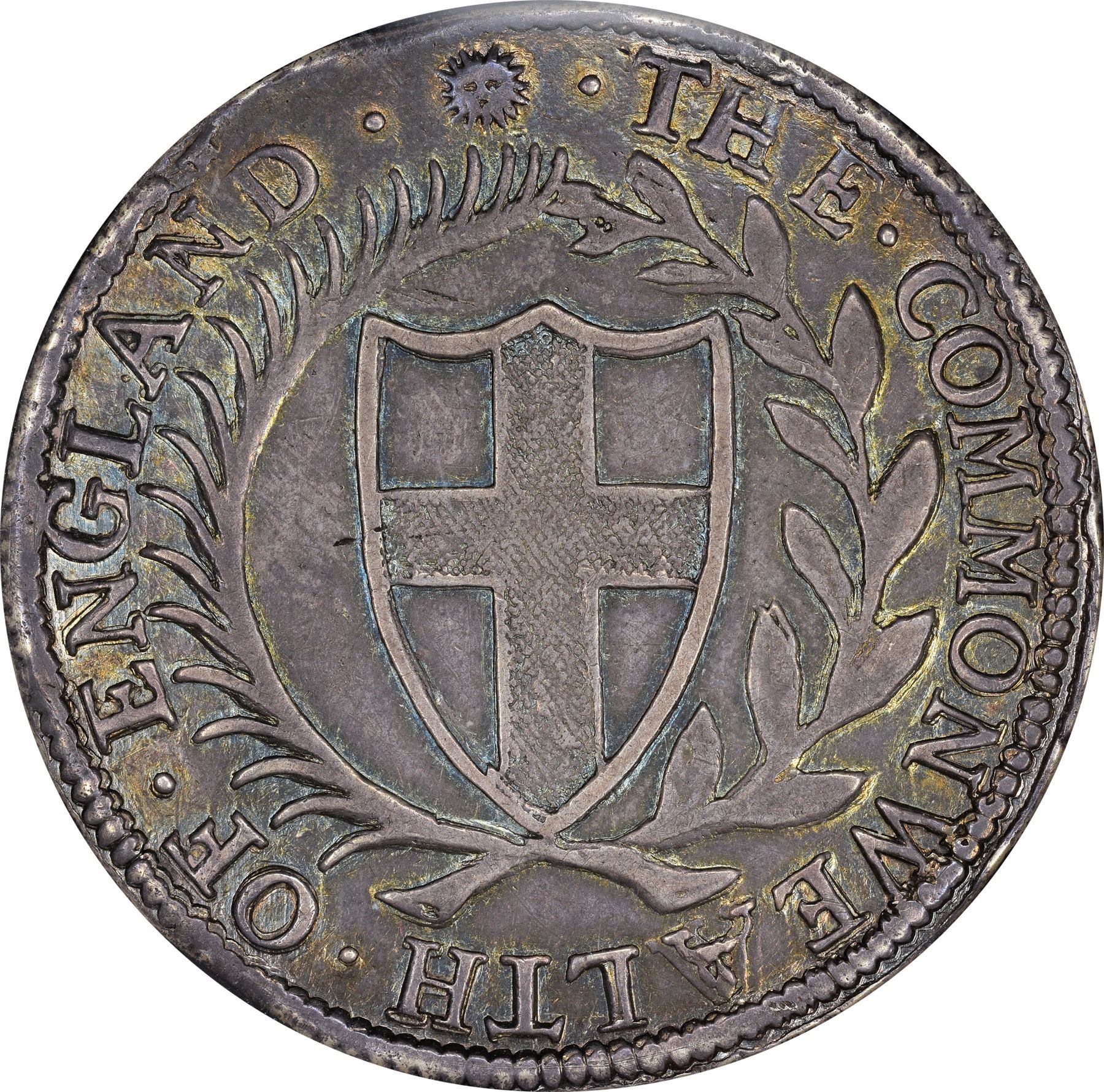 Description: Dies as illustrated. This large – 42 mm – silver-gray crown is lustrous and alive with bursts of bright sunset orange and electric blue. An old mark in the lower left quadrant of the reverse shield is the only negative to be found here. Breaking with tradition, the coins of Cromwell have legends in English rather than Latin, a language which declared Popery to Cromwell’s eyes. Simply superb!