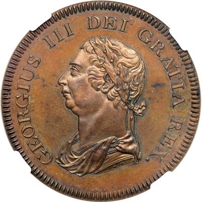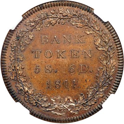 Great Britain. Copper Pattern Five Shillings and Sixpence, 1811. ESC-206 (204 on holder). Obverse 5 berries; Reverse 5a. George III, 1760-1820. Obverse: Draped laureate bust of King left. GEORGIUS III DEI GRATIA REX. Reverse: Inscription within wreath of oak leaves. BANK TOKEN 5S. 6D. 1811. A very nicely made pattern or trial striking of this unusual denomination on a wonderful proof flan. So often now encountered in low grades or scuffed and scratched, this is a remarkable piece. In a new NGC 4 prong holder. NGC graded Proof 63 Brown.