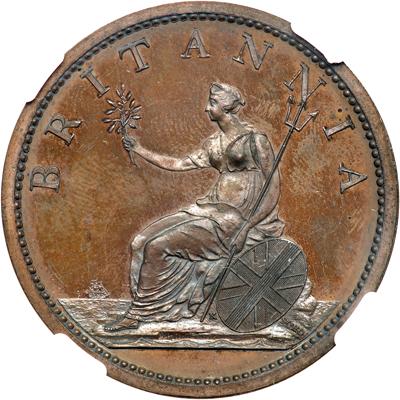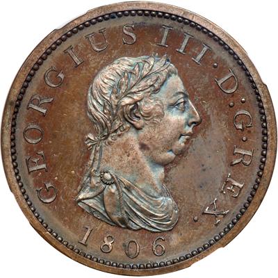 Great Britain. Copper Proof Penny, 1806. BMC-1329; S.3780; KM-663. George III, 1760-1820. Obverse: Draped laureate bust of King right. GEORGIUS III D:G REX. Date below. Reverse: Britannia seated facing left with olive branch, trident and shield. Exergue plain. Edge with center milling. Super deeply struck copper proof with a pleasing blue tone. In a new 4 prong NGC holder. NGC graded Proof 63 Brown.