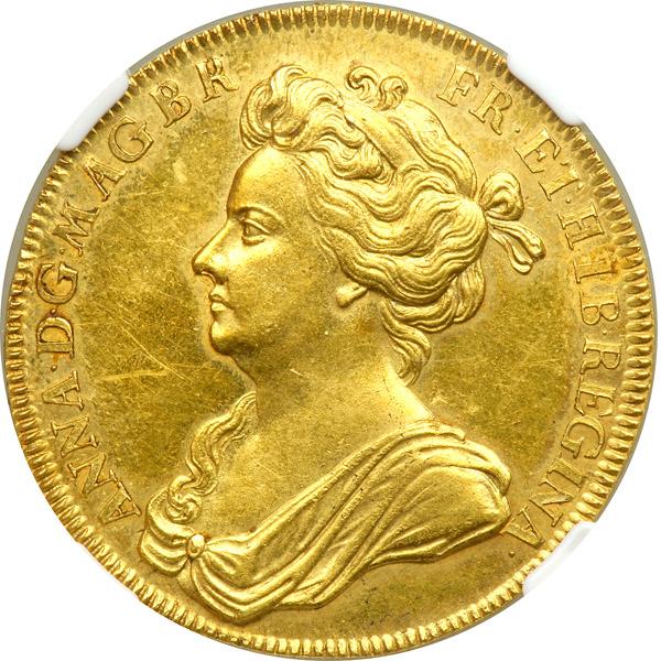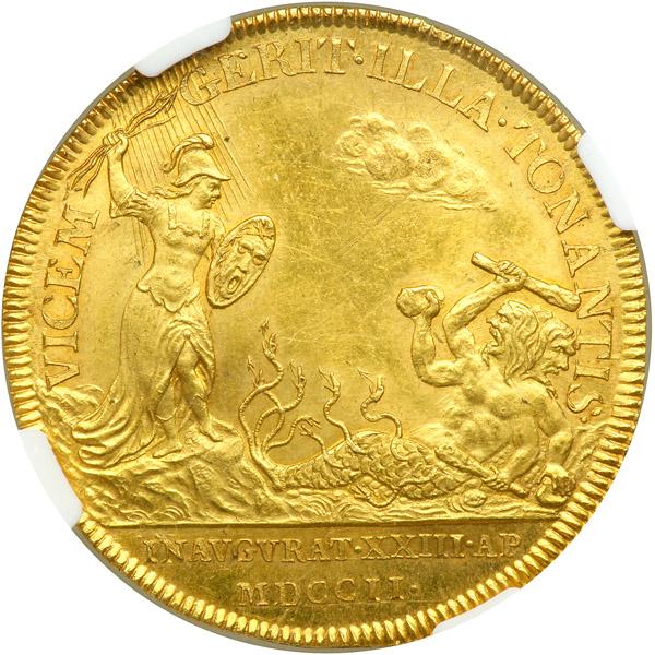 Great Britain. Coronation Gold Medal, 1702. Med Ill. Vol 2. p.228,4. Gold. 18.6 grams. 35 mm. Unsigned. Anne, 1702-1714. For the Coronation. Bust of Anne left. Reverse: Anne, as Pallas, hurls thnder against a double-headed and four-armed monster. Faint reverse adjustment marks. Nice original lustrous example. Very Rare gold medal. NGC graded AU-55.