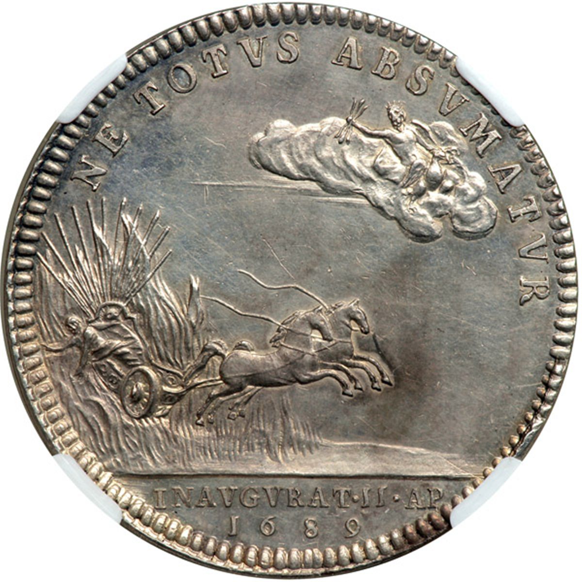 Great Britain. Coronation Medal, 1689. Eimer-312; MI I. 662/25. Struck in silver. 35.2 mm. 16.3 grams. by J. Roettier. William and Mary. Obverse. Conjoined busts of monarchs right. Reverse: Jove throws thunderbolt at Phaethon who falls from chariot. Rare in grade. NGC graded Uncirculated, Details (Surface Hairlines).