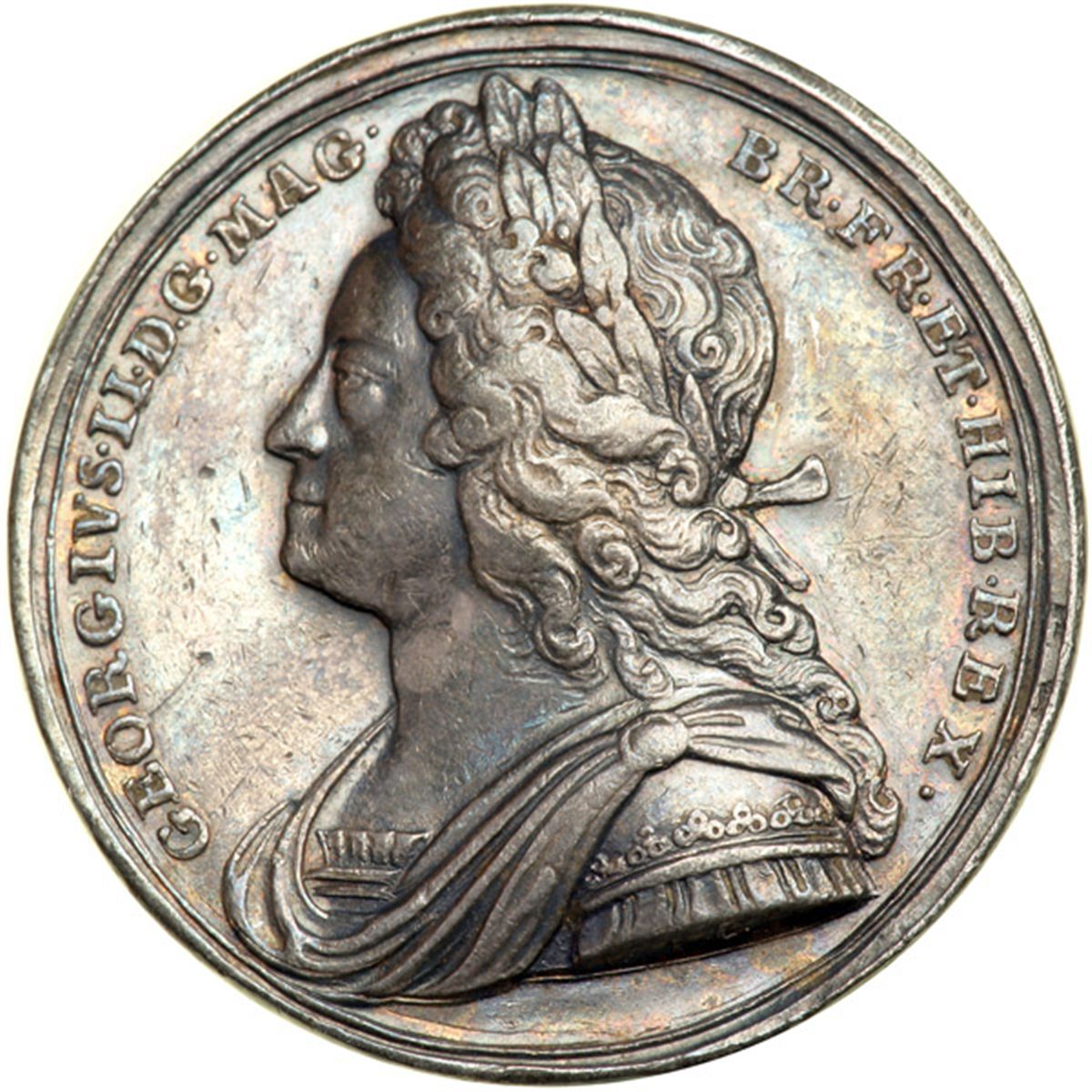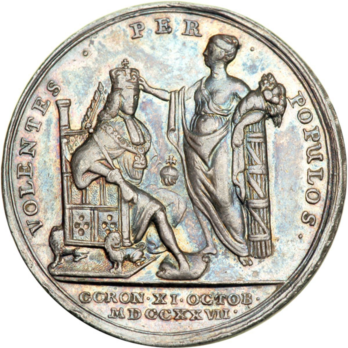 Great Britain. Coronation Medal, 1727. MI-479,4; Eimer-510. Silver. 34 mm. by J. Croker. George II, 1727-1760. Luaureat bust of king left. Reverse: King enthroned right, crowned by Britannia. Toned. NGC graded EF-45.