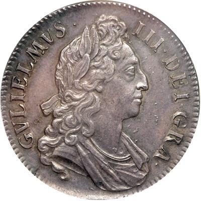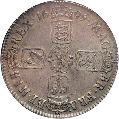 Great Britain. Crown, 1695. S.3470; ESC-86; Dav-3781. William III, 1694-1702. First bust. Edge: SEPTIMO. First year of issue for this king. A delightful specimen! Medium golden gray toning, but bright, evenly distributed on both sides, providing premium eye-appeal. Well struck, the king's hair well defined and the reverse shield exceptionally sharp in all details. Nice high rims and wide denticles. Evidence of die-rust in the fields, and a touch of black alloying flecks in the metal. One of the most pleasing to be found! Very rare in this exalted grade. NGC graded MS-63.
