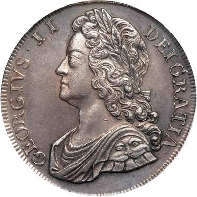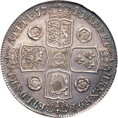 Great Britain. Crown, 1741. S.3687; ESC-123; Dav-1348. George II, 1717-1760. Edge:D.QVARTO. Young laureate bust left. Reverse: Roses in reverse angles. A signal "Roses" crown, one of the prettiest imaginable. NGC graded MS62, probably because of some light old hairlines in the attractive medium gray toning. Strike is sharp all around, with no roller lines visible this time. The luster gleams through the color, and there is nary a mark, even the tiniest, anywhere on the coin. Handsome, and rare so fine. NGC graded MS-62.