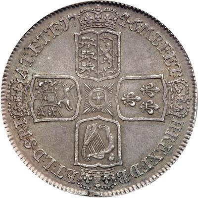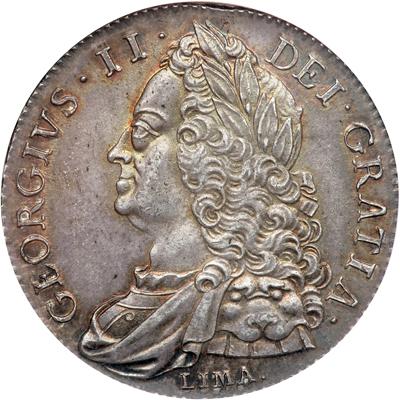 Great Britain. Crown, 1746. S.3689; ESC-125; Dav-1350. George II, 1727-1760. Lima below bust of King. Reverse: Crowned cruciform shields. Edge year DECIMO NONO on edge in raised letters. Some of the treasure seized by Admiral Ansom during his circumnavigation of the globe 1740-1744, and by other privateers, was used to produce coins which had 'LIMA' below the effigy of the King, to celebrate the expedition's successful harassment of the Spanish colonies. A fascinating piece of history and a high quality Crown. Overall, a pretty coin with a lovely medium golden original old tone and lots of luster. NGC graded MS-62.