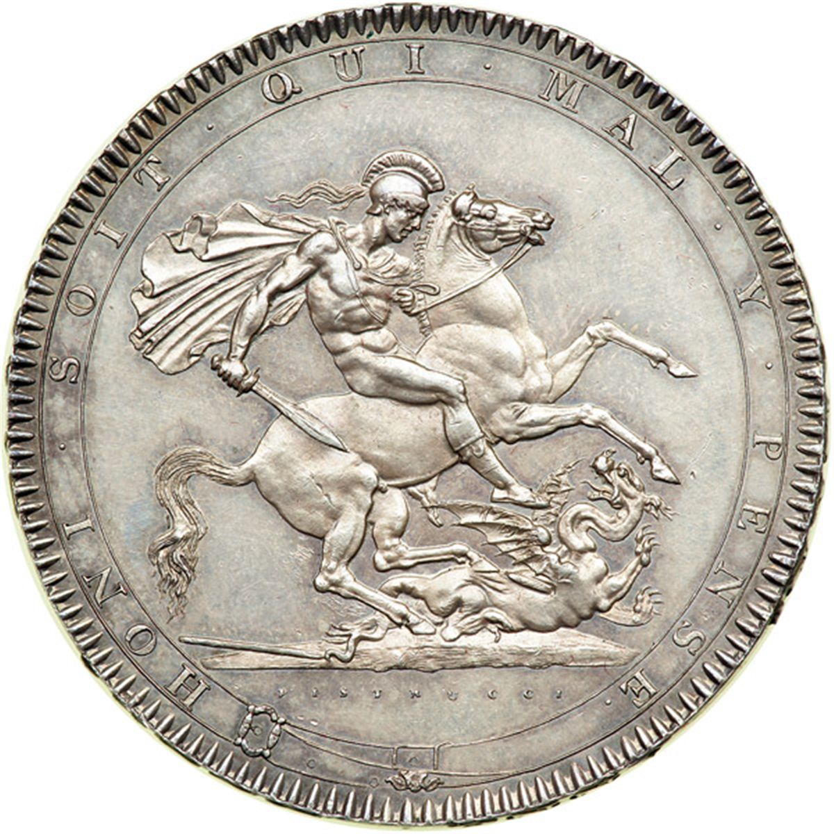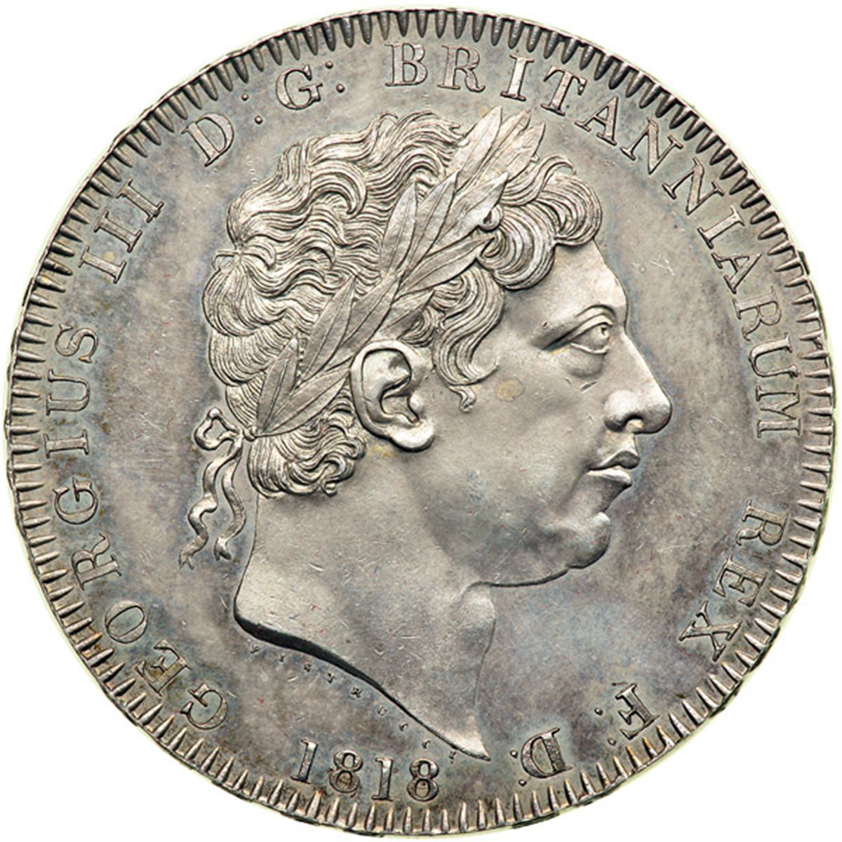 Great Britain. Crown, 1818. S.3787; Dav-103; KM-675. George III. LIX edge. Laureate bust of King facing right. Reverse: Pistrucci's St. George and Dragon. Light gray toning. NGC graded MS-63.