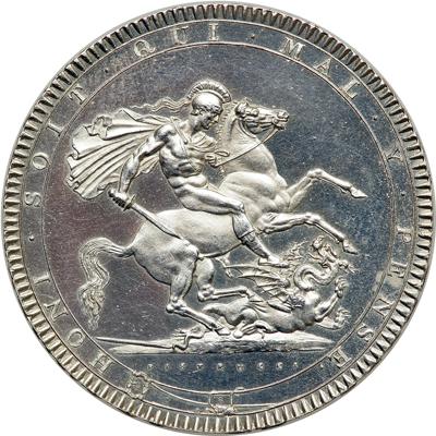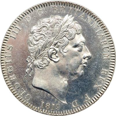 Great Britain. Crown, 1819. S-3787; ESC-215; Dav-103; KM-675. George III, 1760-1820. LIX edge date. Brilliant prooflike uncirculated, possible unrecorded Proof with deeply mirrored fields surrounding gleaming, fully struck devices: an unusually crisp portrait of the king, and on the reverse Saint George slaying the dragon. Lightly cleaned with some light abrasions on each side. Uncirculated.