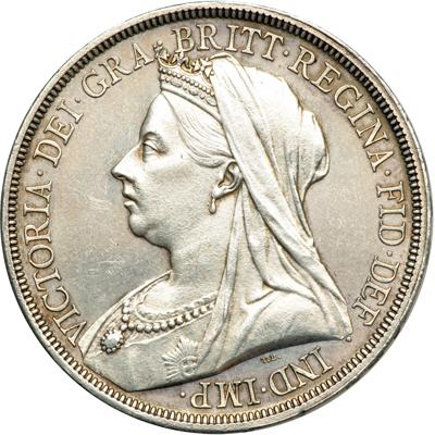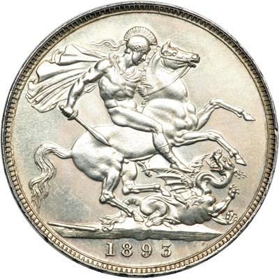 Great Britain. Crown, 1893. S.3937; Dav-108; ESC-303; KM-783. Victoria, 1837-1901. LVI on edge. Obverse: Old crowned bust of Queen wearing veil, facing left. Reverse: Pistrucci's St. George slaying the dragon. Very light cleaning. The first date in this popular series. Strong detail and a bright prooflike quality distinguish this coin. Almost Uncirculated to Uncirculated.