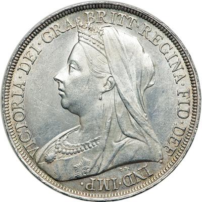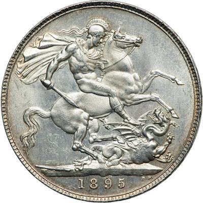Great Britain. Crown, 1895. S.3937; ESC-309; KM-783. Victoria, 1837-1901. Edge LIX. Obverse: Old crowned bust of Queen wearing veil. Reverse: Pistrucci's St. George and Dragon. Another scarcer date. Tough to find. Light hairlines. A lovely coin with good eye appeal and original luster under a light pastel tone. Uncirculated.