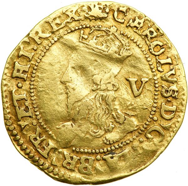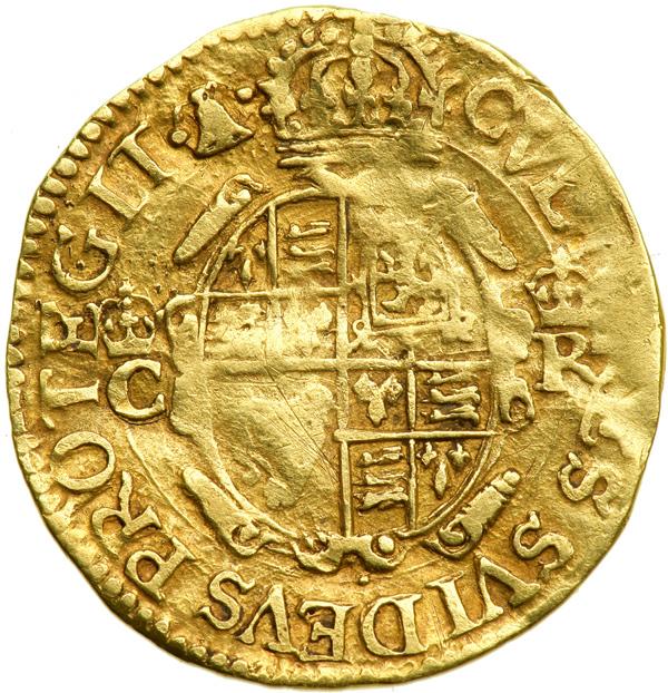 Great Britain. Crown, ND. S.2714; Fr-248. Charles I, 1625-1649. Tower mint under the King. Mint mark, Bell (1634-5). Crowned bust left, with value behind. Reverse: Crowned oval shield with C R at sides. Slightly damaged, light scratches on both sides. NGC graded Fine, Details.