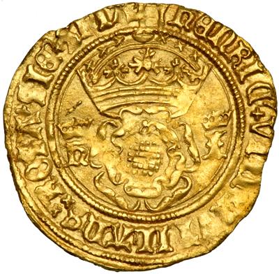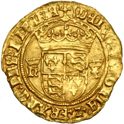 Great Britain. Crown of the Double Rose, ND. S.2279; Fr-164. Henry VIII, 1509-1547. Henry and Jane Seymour issue (1536-1537). Obverse: Large crowned double rose, crowned letter h and I on either side. Reverse: Crowned Tudor shield, crowned letters h and I either side. Arrow or pheon mintmark. This very pretty specimen is similar in type and mintmark to lot 285 in the (May 26 2008) Millennia Collection. On a large flan it is a bold and lustrous example of one of the rarer varieties of a new denomination. An excellent and well struck piece for this crude issue. NGC graded AU-55.
