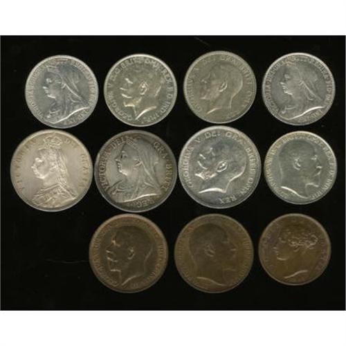 <B>Desirable British type coins:</B></I> Victoria copper Halfpenny 1841, S-3949, chocolate-brown Unc. and sharp, Halfcrown 1887, S-3924, silvery toned Unc. and very handsome, Florin 1893, S-3939, Choice AU and bright, Florin 1895, brilliant AU, Halfcrown 1901, S-3938, Choice lightly toned AU, Edward VII Penny 1910, S-3990, brown AU, Florin 1902, S-3981, lightly wiped Unc., George V Penny 1911, S-4051, Choice R&B Unc., Florin 1911, S-4012, brilliant Proof, Halfcrown 1914, S-4011, brilliant Unc. with light abrasions and the usual light friction on the obverse, Florin 1933, S-4038, silvery gray toned Unc. All in all, a nice group.<BR><BR><b>Shipping:</b> Coins & Currency (<a target="_blank" href="http://www.heritageauctions.com/common/shipping.php">view shipping information</a>)