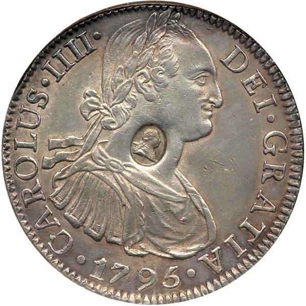 Great Britain. Dollar, ND. S.3765; ESC-129; KM-634. George III. Oval countermark with head of George III on a 1795 Mexico City 8 Reales. Attractively toned. NGC graded AU-53.
