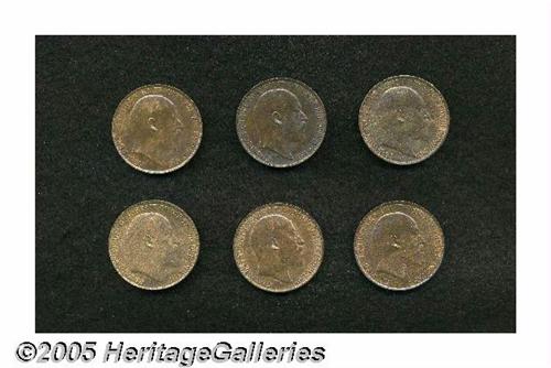 <B>Edward VII Penny lot as follows:</B></I> 1902 High Tide, AU; 1903, XF; 1905, AU; 1906, AU; 1907, XF; and an 1908, lustrous Unc.