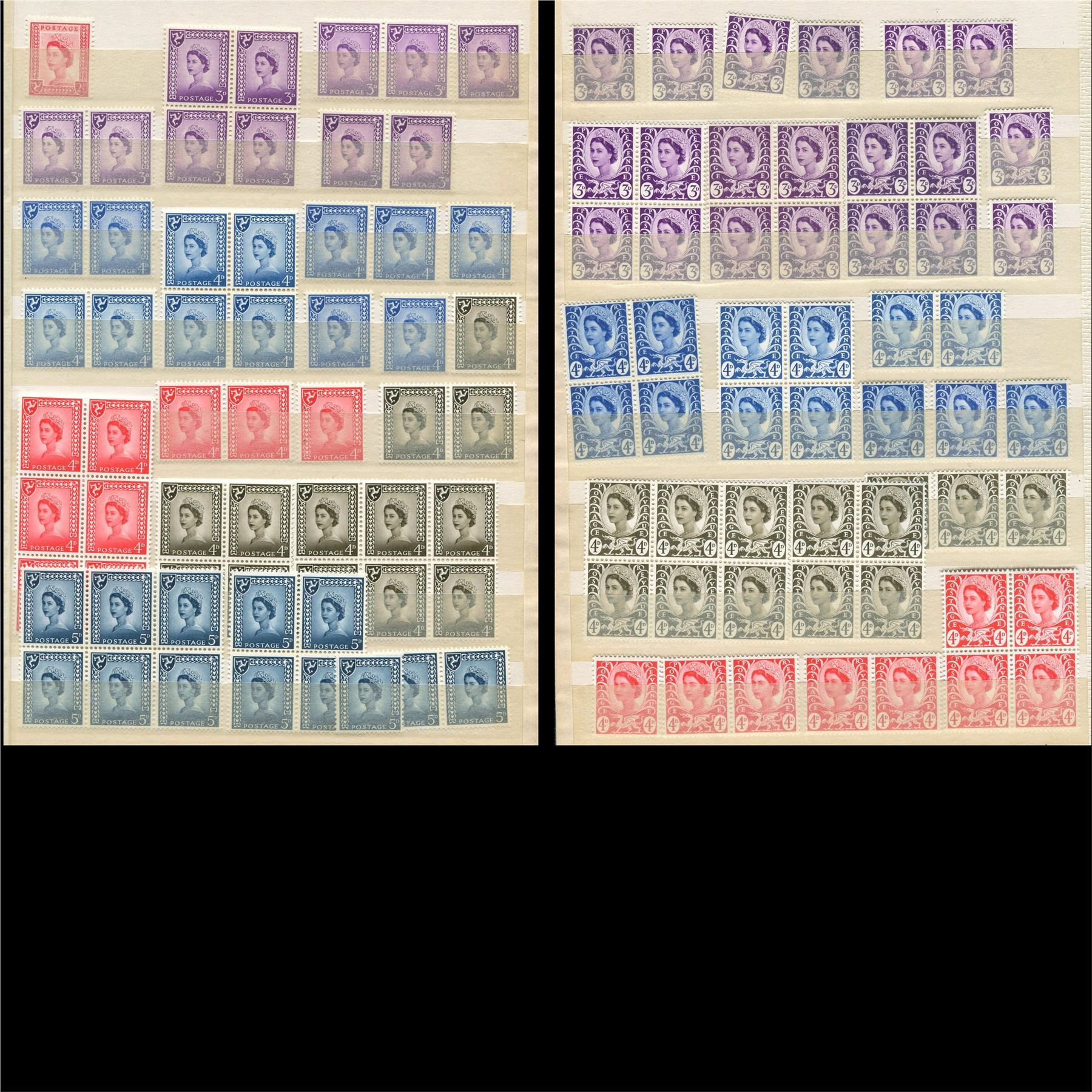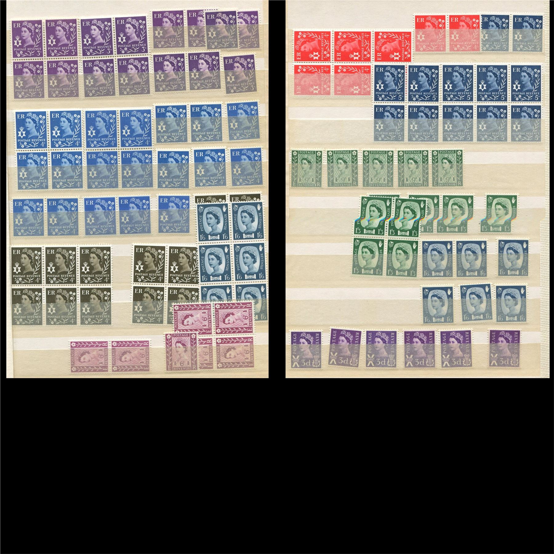Great Britain Elizabeth II mint stamp collection. This collection contains over 500 mint stamps. Included are stamps from Northern Ireland, Scotland, Wales and Momouthshire, Machins, blocks and singles.