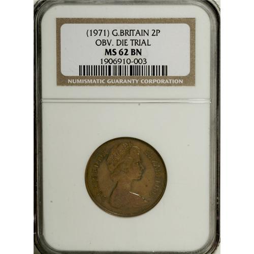 <B>Elizabeth II Obverse die-trial strike for bronze Twopence (1971),</B></I> MS62 BN NGC, pleasant color, reverse blank, rare.<BR><BR><b>Shipping:</b> Coins & Currency (<a target="_blank" href="http://www.heritageauctions.com/common/shipping.php">view shipping information</a>)