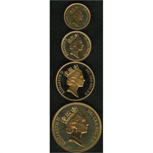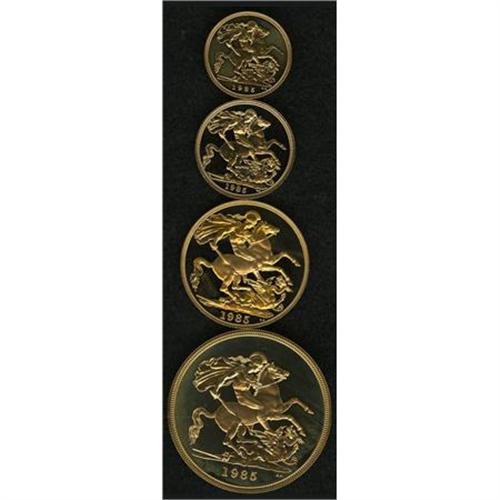 <B>Elizabeth II gold Proof set 1985,</B></I> S-PSG06, 4 coins in long RM case as issued, all in capsules: £5, £2, Sovereign and Half Sovereign. Gem Proofs.<BR><BR><b>Shipping:</b> Coins & Currency (<a target="_blank" href="http://www.heritageauctions.com/common/shipping.php">view shipping information</a>)