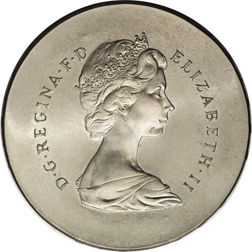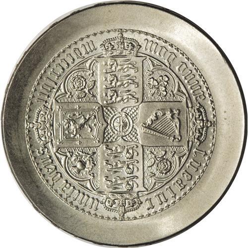 <B>Elizabeth II pattern Decimal Crown</B></I> struck on an Irish 10-Shilling flan, showing the 10-Shillings obverse portrait, mated to a reverse styled after the Gothic Crown (of 1847-53, dated 1847 in roman numerals). Reverse die-axis turned to 45-degree angle. Edge inscription reads "DEI. GRATIA. : FID. DEF. REGINA :" in very bold, raised or upset letters. Possibly unique. Comes with Spink ticket pricing it at $2,500 (today, about $5,000). Gem Uncirculated, essentially as struck.<BR><BR><b>Shipping:</b> Coins & Currency (<a target="_blank" href="http://www.heritageauctions.com/common/shipping.php">view shipping information</a>)