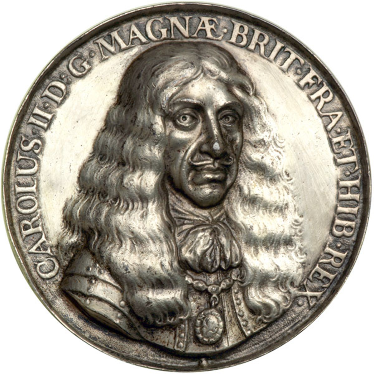 Great Britain. Embarkation at Scheveningen Medal, 1660. Med Ill. 455,44; Eimer-210. 70 mm. Silver medal consists of two cast embossed plates joined at the edge by a broad rim. Charles II, 1660-1685. Executed in Holland by Peter van Abeele, to commemorate the embarkation, on June 2, 1660, of Charles II and his Court at Scheveningen, on his restoration to England. Three-quarters bust of Charles II draped facing right. Reverse: Fame with ribbon inscribed flying over a fleet under sail. Very Fine.