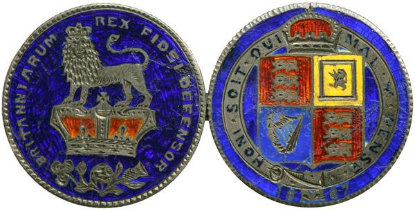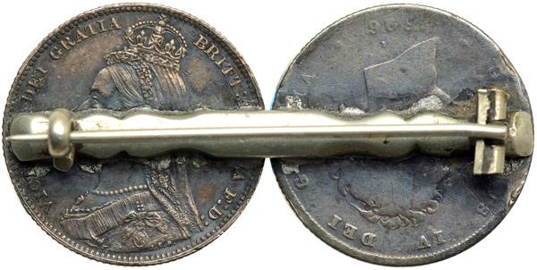 Great Britain. Enamel Pin Brooch using Two Shillings: Using the reverses of a 1826 Shilling of George IV and the reverse of a Victoria Jubilee 1887 Shilling. Royal blue, red and yellow colors. Average Condition.