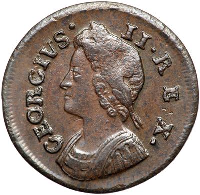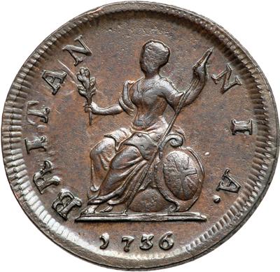 Great Britain. Farthing, 1736. S.3720; KM-572. George II, 1727-1760. Obverse: Laureate cuirassed bust left. Reverse: Britannia left with pike and shield. Date in exergue. Softly struck in the hair. Lustrous. Extremely Fine to About Uncirculated.