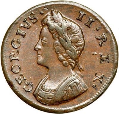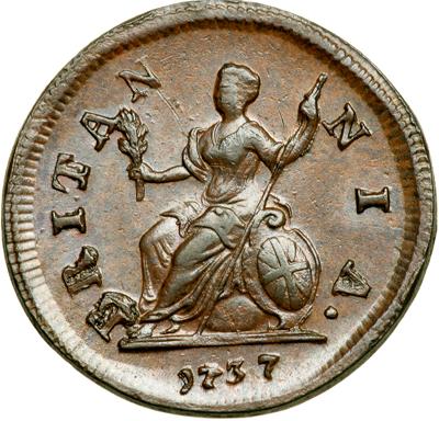 Great Britain. Farthing, 1737. S.3720; KM-572. Small date. George II, 1727-1760. Draped bust of King left. Reverse: Britannia with spear and olive branch. Glossy brown, a high grade example of this small denomination. NGC graded MS-62 Brown.