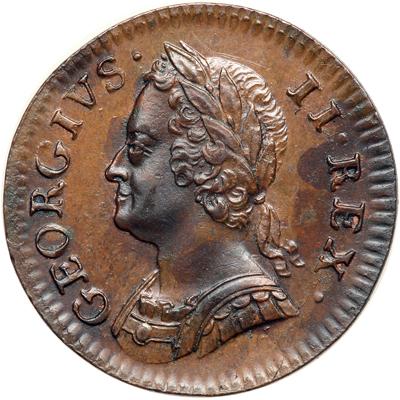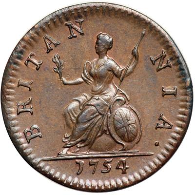 Great Britain. Farthing, 1754. S.3722; KM-581.2. George II, 1727-1760. Obverse: Laureate and cuirassed bust of King left. Reverse: Britannia with shield. Date in exergue. A sharply struck specimen with a tiny hint of mint red. Not easily available any more. Almost Uncirculated to Uncirculated.