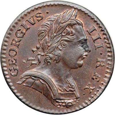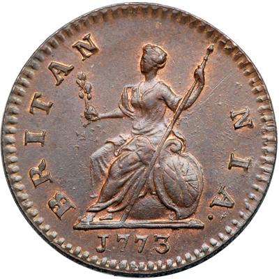 Great Britain. Farthing, 1773. S.3775. George III, 1760-1820. Laureate cuirassed bust of King right. Reverse: Britannia with shield left. Glossy, well centered, and sharply struck with much original color. Uncirculated.