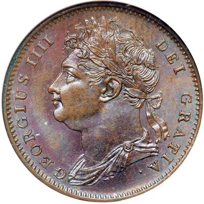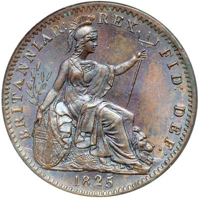Great Britain. Farthing, 1825. S.3822; KM-677. George IV. Laureate and draped bust left. Reverse: Britannia right. Nice surfaces. ANACS graded MS-66 Brown.