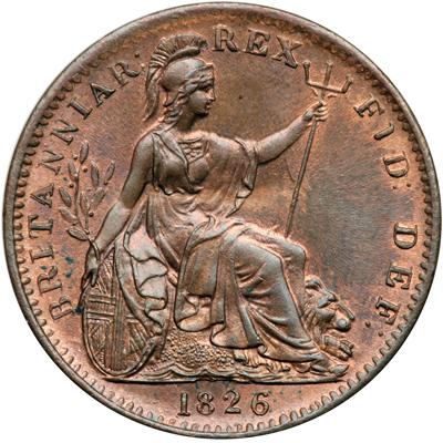 Great Britain. Farthing, 1826. S.3824; KM-677. George IV. First type. Draped laureate bust left. Reverse: Britannia right. A scarce date and type in tip top grade with lots of original color. Uncirculated.