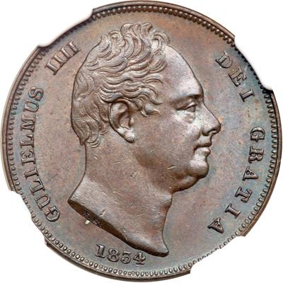 Great Britain. Farthing, 1834. S.3848; KM-705. William IV. Bare head right. NGC graded MS-62 Brown.