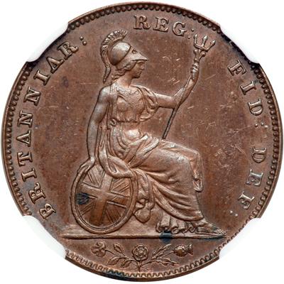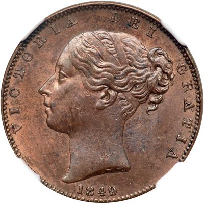 Great Britain. Farthing, 1849. S.3950; KM-725. Victoria, 1837-1901. Obverse: Wyon's young portrait of Queen left. Reverse: Britannia with shield and trident. A key date farthing, rarely seen in top grade. Mint luster with red on obverse and reverse. Very tough to replace. In new NGC 4 prong holder. NGC graded MS-63 Brown.