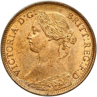 Great Britain. Farthing, 1860. S.3958; KM-747.2. Victoria, 1837-1901. Smaller bronze type. Toothed border. Wyon's young portrait of Queen with hair in bun. Reverse: Britannia seated right with shield and trident. Virtually full original luster on this top class specimen. No longer easy to find in this grade. Uncirculated.