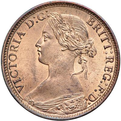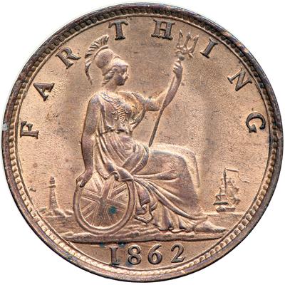 Great Britain. Farthing, 1862. S.3958; KM-747.2. Victoria, 1837-1901. Wyon's young portrait of Queen with hair in bun. Reverse: Britannia seated right with shield and trident. Full original color. Uncirculated.