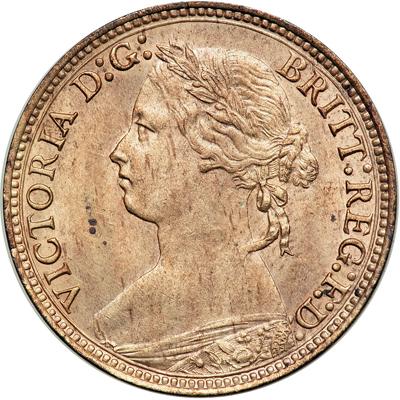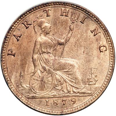 Great Britain. Farthing, 1879. S.3958; KM-753. Victoria, 1837-1901. Large 9 in date. Wyon's young portrait of Queen with hair in bun. Reverse: Britannia right with shield and trident. Retaining a lot of mint red. Uncirculated.