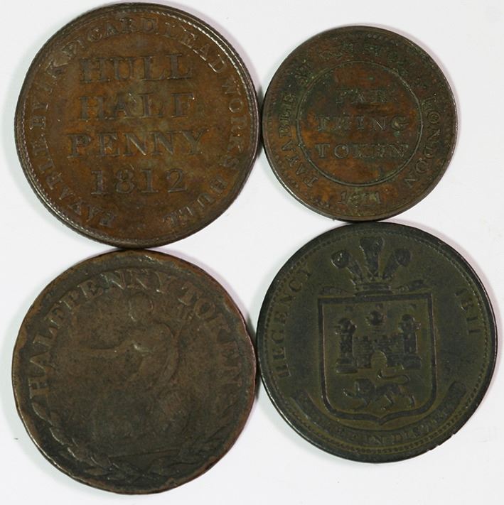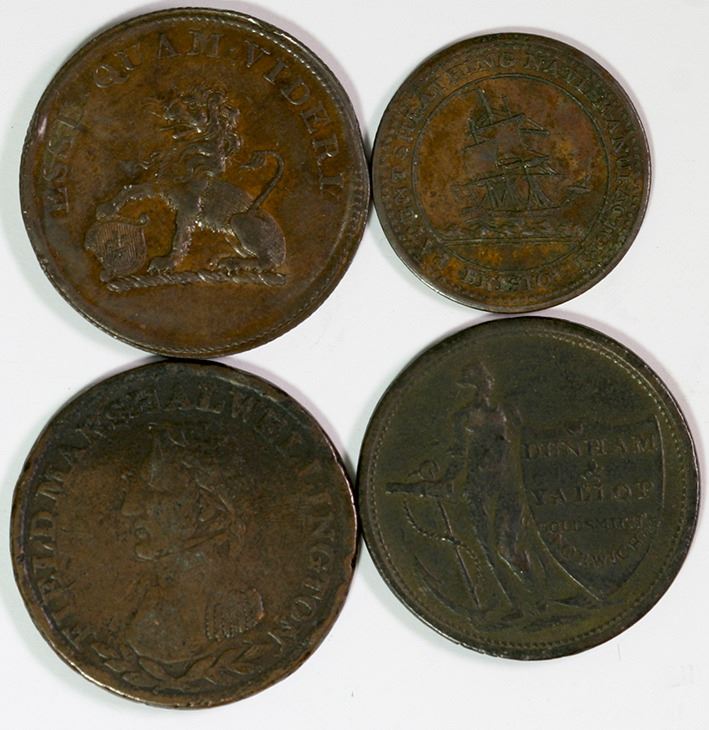 Farthing, Somersershire, 1811, Patent Sheathing Nail Manufactory (D.119); Halfpenny, Yorkshire, 1812, I.K.Picard (W.785), Norwich, 1811, Dunham (W.914), Wellington, No date, Marshall (W.1497). Very fine. (4)