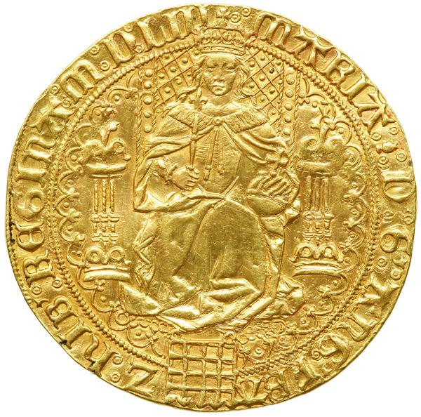 Great Britain. 'Fine' Sovereign, 1553. S.2488; Fr-192. Mary, 1553-1554. Mint mark, pomegranite. Obverse: Crowned portrait of the queen holding orb and scepter with the date in Roman Numerals in the legend. Reverse: Shield on large Tudor rose. Appears to possibly been mounted and repaired in the field. Otherwise a magnificent piece with fine detail. Extremely Fine.