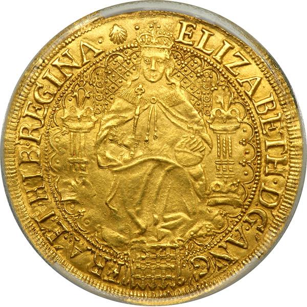 Great Britain. 'Fine' Sovereign of 30 Shillings, ND. S.2529; N-2003; Fr-209. Elizabeth I, 1558-1603. Fifth Coinage (1583-1600). Mint mark, Escallop (1584-1586). Obverse: Elizabeth enthroned facing. Reverse: Shield within rose. Struck on a full flan with no flaws or splits, the portrait showing remarkably fine details. A lovely coin that deserves a full Mint State grade. PCGS graded AU-58.