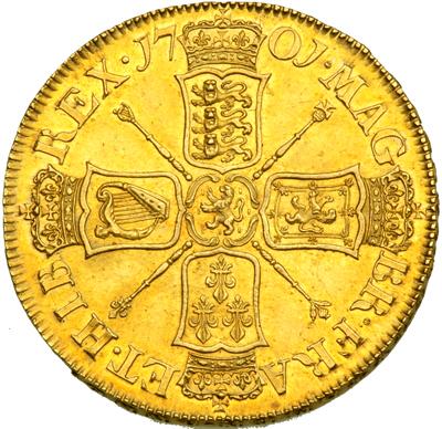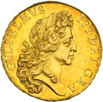Great Britain. 'Fine Work' 5 Guineas, 1701. S-3456; Fr-310; KM-508. William III, 1694-1702. Second Bust type ('fine work'). Laureate head of William right. Reverse: Crowned cruciform shields with plain sceptres, no stops after MAG, FRA or HIB, lettered edge reads +DECVS. ET. TVTAMEN. ANNO. REGNI.DECIMO. TERITO +. Sharply struck example with fine hair detail. The 'Fine Work' gold coins of William III are among the most spectacular of the period. Surfaces are prooflike and gleaming with luster.
