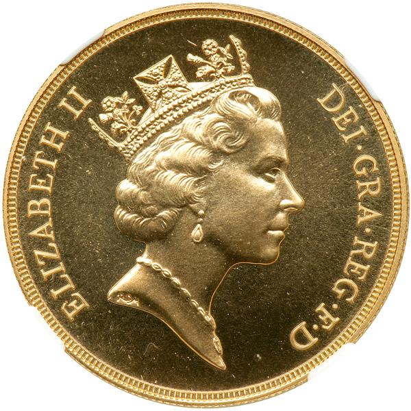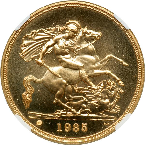 Great Britain. Five Pounds, 1985. S.4252; Fr-422; KM-945. Weight 1.1775 ounces. Elizabeth II. Crowned bust right. Reverse: St George slaying dragon. NGC graded MS-68.