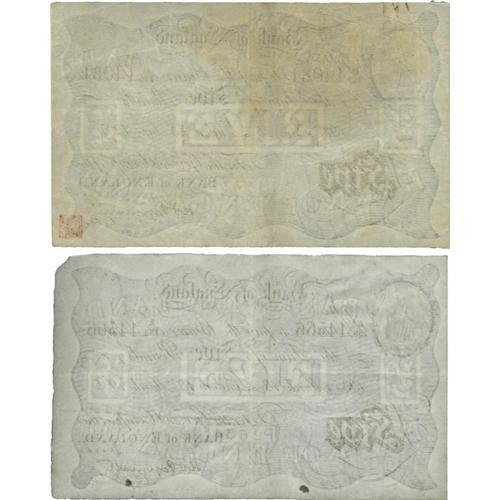 <B>Great Britain</B></I> Five Pounds March 18, 1935 Pick 335a, Counterfeit "Operation Bernhard" June 23, 1937 <BR> The yellowed example with a stamp on the back giving it the appearance of authenticity is coupled with the genuine article. Both notes grade a most pleasing <B>Very Fine.</B></I> The real note does have a couple of transparent spots visible.<BR><BR><b>Shipping:</b> Coins & Currency (<a target="_blank" href="http://www.heritageauctions.com/common/shipping.php">view shipping information</a>)