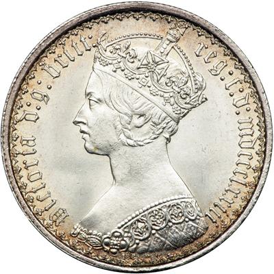 Great Britain. Florin, 1873. S.3893; ESC-841; KM-746.2. Victoria, 1837-1901. Obverse: Crowned portrait of Victoria facing left with hair braided and ornate gothic-style bodice, gothic script. Date in Roman numerals. Reverse: Crowned cruciform shields and legend 'one florin one tenth of a pound'. This coin has a nice frosty look with a very light golden peripheral tone. The obverse is particularly crisply struck for this issue. Great eye appeal. NGC graded MS-64.